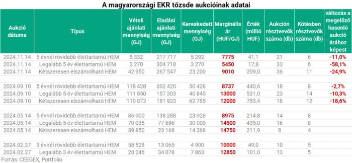 A legalábbi 5 év élettartamú HEM-ek áránál durva, 58,1%-os zuhanást látunk 5450 forintra a szeptemberi aukción kialakult árhoz képest, de a kétszeresen elszámolható HEM-ek ára is nagyot esett (-24,9%, 9010 forint/gigajoule).