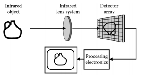 Szükség van megfelelő lencsére, ami képes egy külső tárgyról képet alkotni termikus hullámhossz tartományba eső sugárzás segítségével. Majd a beérkező sugárzást a detektor digitális jellé alakítja, amit pedig a processzor videójellé konvertál. Végül pedig szükséges egy kijelző, ami megjelenti termikus képet.